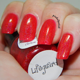 Next up is Lifeguard, who needs saving, I DO!!!!:) This is a bright Cherry Red holo, that reminds me totally of maraschino cherries, juicy!!! Here is 2 coats of Lifeguard over nude with a coat of SV!!! *I recommend wearing a base as reds and blues can stain those pretty nails!!!